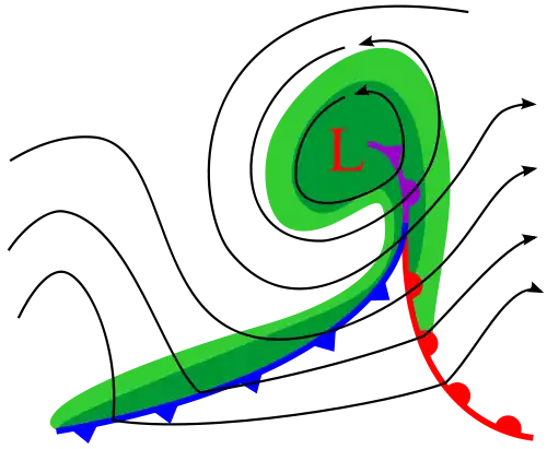 An occluded front or occlusion usually forms around a low pressure system (Figure 16.20). The occlusion starts when a cold front catches up to a warm front. The air masses, in order from front to back, are cold, warm, and then cold again. The boundary line, where the two fronts meet, curves towards the pole because of the Coriolis effect. If the air mass that arrives third is colder than either of the first two air masses, that air mass will slip beneath the other two air masses. This is called a cold occlusion. If the air mass that arrives third is warm, that air mass will ride over the other air mass. This is called a warm occlusion.