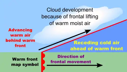- The opposite occurs at a warm front, except that the warm air slips above the cold air mass.