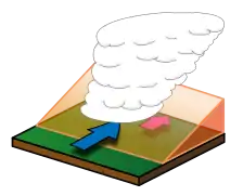 When a cold air mass takes the spot of a warm air mass, there is a cold front (Figure 16.16). Since cold air is denser than the warm air, the cold air mass slides beneath the warm air mass and pushes it up. As the warm air rises, there are often storms.