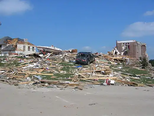 Damage from hurricanes tends to come from the high winds and rainfall, which can cause flooding. Near the coast, flooding is also caused by storm surge (Figure 16.33). Storm surge occurs as the storm’s low pressure center comes onto land, causing the sea level to rise unusually high. A storm surge is often made worse by the hurricane's high winds blowing seawater across the ocean onto the shoreline. Storm surge may rise as high as 7.0 to 7.5 m (20 to 25 feet) for up to 160 km (100 miles) along a coastline. If a storm surge is channeled into a narrow bay, it will greatly increase in height.