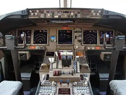 Not only was computer technology essential for the design of the 777, it is essential for the 777 control system, which is computer-based. In previous Boeing airliner designs, the pilots' controls were connected by cables to hydraulic actuators that caused control surfaces to move. In contrast, in the 777 design, the pilots' control movements are input to a computer system which determines electrical signals to send over wires to actuators. This fly-by-wire system saves significant cost and weight, but requires sophisticated and reliable computer systems to control the plane in response to the pilots' inputs. The fly-by-wire system allows the 777 to be flown by a crew of only two (a pilot and a copilot); without the system, a much larger crew would be required. Figure 31 shows the cockpit of the Boeing 777. Development of the 777 fly-by-wire system required writing and debugging millions of lines of computer code.