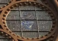 - (a) What is the exact radian measure in terms of π between two consecutive circular dots on the small circle in the center of the window?