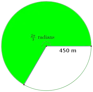 If the irrigation pipe is 450 m in length, what is the area that can be irrigated after a rotation of radians? Solution: Using the formula: