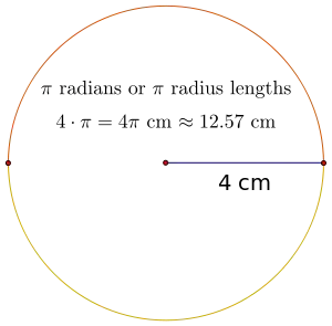 The length of an arc on a circle depends on both the angle of rotation and the radius length of the circle. If you recall from the last lesson, we defined a radian as the length of the arc the measure of an angle θ in radians is defined as the length of the arc cut off by one radius length, so that a half-rotation is π radians, or a little more than 3 radius lengths around the circle. What if the radius is 4 cm? The length of the half-circle arc would be π radius lengths, or 4π cm in length.