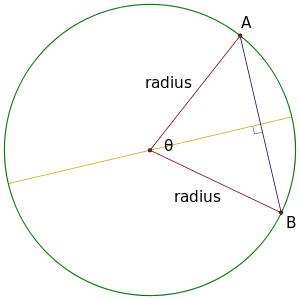 Next, if we bisect the angle, the angle bisector must be perpendicular to the chord (we will leave the proof of this to your Geometry class). This forms a right triangle.