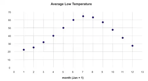 Because the months cycle each year, 13 represents January of the next year, and in general, we can predict the weather in January given our knowledge of the usual climate in a location. For example, January is the coldest month of the year in the city of Boston. For the years shown in the table, the average low temperature was about 22 degrees. We can therefore predict that the average low temperature in January in Boston will be about 22 degrees. We could use such a function to compare current weather to past weather and test for climate changes over time.