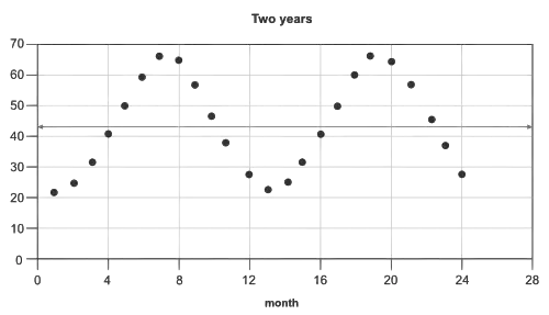 Notice that the data ranges from about 22 to 65. Also notice that the "wave" centers in between these values, around y = 43. Therefore we say that the amplitude of the wave is about 21, which is the distance from the middle to the top or the bottom of the wave.