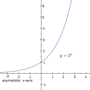 Exponential y = 2x, y = 3x, etc. Exponential functions have a variable as an exponent. The graph has a horizontal asymptote. As x approaches , the function values approach the x−axis (y = 0).