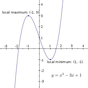 Cubic y = x3 These functions have a highest exponent of 3. The ends of the graph have opposite behavior. Cubic graphs either have a local maximum and minimum, like the one in the graph to the right, or no local maximums or minimums, like y = x3.