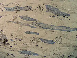 When rocks are metamorphosed by pressure as well as heat, they undergo foliation, in which sheet silicates, if they are present in the rock, rearrange themselves so that the sheets are at right angles to the direction of pressure. The picture to the right shows a view of foliation under a microscope.