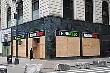 A Manhattan GameStop is boarded up in the turbulent year of 2020. Many American retailers boarded up their windows in preparation for turbulent events.[10]
