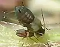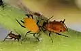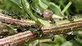 Aphid infestation on broccoli plant. Note that most of the aphids one sees in a plant infestation are juveniles.