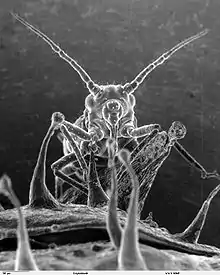 Aphids, also known as greenfly, blackfly or plant lice, are minute plant-feeding insects in the superfamily Aphidoidea in the homopterous division of the order Hemiptera. Recent classification within the Hemiptera has changed the old term 'Homoptera' to two suborders: Sternorryncha (aphids, whiteflies, scales, psyllids...) and Auchenorryncha (cicadas, leafhoppers, treehoppers, planthoppers...) with the suborder: Heteroptera containing a large group of insects known as the 'true-bugs'; gnat bugs, pond skaters, shore bugs, toad bugs, water boatmen, backswimmers, etc.