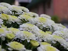 Modern chrysanthemums are much more showy than their wild relatives. The flowers occur in various forms, and can be daisy-like, decorative, pompons or buttons. This genus contains many hybrids and thousands of cultivars developed for horticultural purposes. In addition to the traditional yellow, other colours are available, such as white, purple, and red. The most important hybrid is Chrysanthemum × morifolium (syn. C. × grandiflorum), derived primarily from C. indicum but also involving other species.