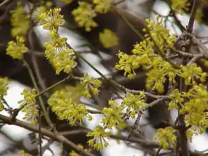 The European Cornel (Cornus mas) is a species of dogwood native to southern Europe and southwest Asia. It is a medium to large deciduous shrub or small tree growing to 5–12 m tall, with dark brown branches and greenish twigs. The leaves are opposite, 4–10 cm long and 2–4 cm broad, with an ovate to oblong shape and an entire margin. The flowers are small (5–10 mm diameter), with four yellow petals, produced in clusters of 10-25 together in the late winter, well before the leaves appear. The fruit is an oblong red drupe 2 cm long and 1.5 cm in diameter, containing a single seed.