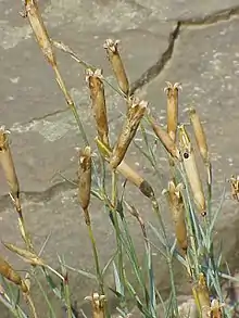 The flowers are solitary or in panicles, with leafy bracts beneath and five petals, typically with a frilled or notched margin. In almost all species they are pale to dark pink, but at least one species (D. knappii) has yellow flowers with a purple centre.