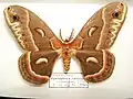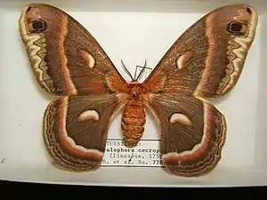 The life cycle of the moth is much like any other saturniidae species. It lays oval-shaped, light brown eggs on the leaves of the host plant. When the eggs hatch, small black and hairy caterpillars emerge (first instar), and eat their eggshells.Sometimes the newly hatched caterpillars have yellow bristles, which darken in a few minutes. As the caterpillars age, they molt 5 times. The second instar is yellow-green with black spots and spiny orange, yellow and blue knobs. The third and fourth instars have smaller spines, and are similar to each other. The fifth instar is a whitish color with bright yellow, blue and red knobs. The caterpillars feed heavily on their host plant and can grow up to five inches long. They then spin cocoons of brown silk, usually wrapped in leaves of the host plant. They then pupate inside the two-layered cocoon. There is only one brood per year, the cocoon overwintering and emerging in spring. When the adults eclose, they have to pump fluid into their wings to extend them. The females emit pheromones at night, which the male can detect with its large, bushy antennae. Males can fly for miles in order to reach a female. The moths mate, and the female spends the remainder of her life laying eggs, while the male may mate several more times. Because the adult moths do not have mouth parts they are unable to eat. As a result, the lifespan for an adult Cecropia moth is generally only 7 to 10 days in the wild, perhaps a little longer or shorter, depending on how much movement the moth makes. For instance, if temperatures are cooler, the moth may remain mostly inactive, which will increase its life. In captivity, this lifespan can be extended to about a month by placing the moth in the fridge directly after it hatches and its wings are dry. (Those who intentionally rear the moths may find this necessary to synchronize mating.)