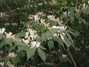 Lonicera maackii (Amur Honeysuckle or Bush Honeysuckle) is a species of honeysuckle in the family Caprifoliaceae, native to temperate Asia in northern and western China (south to Yunnan), Mongolia, Japan (central and northern Honshū, rare), Korea, and southeastern Russia (Primorsky Krai).[1] It is listed as an endangered species in Japan.[2][3] It has escaped from cultivation and become naturalised in New Zealand and the eastern United States; in the forests of the latter, it has become an important invasive species.[4]