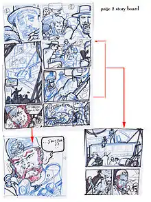 Storyboarding is used to plan what is going to be in the panels and to help with deciding the layout of a comic. To begin, draw small sketches of key events in your story and put them in order in front of you. Draw more of these frames until you have enough to tell the story.