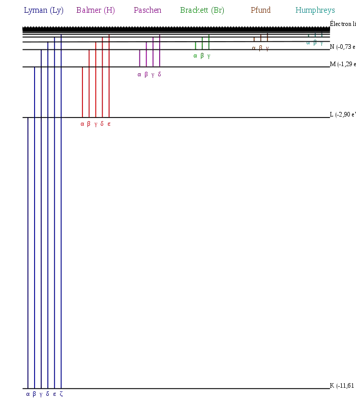 2.2.2 : Electrons are excited (usually by running an electric current through them). This causes electrons to 'jump' into higher electron shells ( X -> X* ) this state is only temporary, however, and the electron falls back to its ground state. This change (When the electron falls back from the higher shell to a lower one) decreases the energy of the electron, and this energy is emitted in the form of a photon. If this photon falls into the visible spectrum of light, then it produces a visible spectrum. As electrons move further away from the nucleus, the electron shells become closer together in terms of space and energy, and so lines converge towards the end of the spectrum.