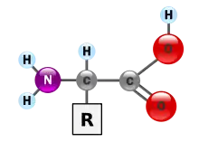 Basic structure of an amino acid. Proteins are strings of amino acids linked by hydrogen bonds