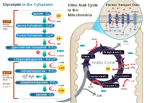 Power stations convert the energy in coal to electricity, which drives the computations of electronic computers. Living cells have their own built-in power stations to provide energy for their computations. Cell respiration is a cascade of metabolic reactions (glycolosis, the Krebs cycle and the electron transport chain) that transfer the energy of the intricately bound bonds of glucose into the more immediately utilisable ones of ATP.