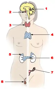 Major endocrine glands: 1. Pineal gland 2. Pituitary gland 3. Thyroid gland 4. Thymus 5. Adrenal gland 6. Pancreas 7. Ovary 8. Testes