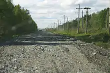 Some rough terrain on the Amur Highway, between Chita and Birobidzhan (2004) - The Road of Bones (in Northeastern Siberia) - Branching off the Amur Highway, near Never, the 4,000 km (2,600 mi.) long road heads Northeast through Yakutia, a vast expense of land covered with thick taiga, to reach the Pacific ocean port of Magadan. The unpaved road is known to be extremely difficult with featuring dirt, gravel, and collapsed bridges and has remained a major challenge for motorcyclists, few having succeeded in riding it all the way through.