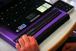 Refreshable Braille Displays are an electronic device, connected to a computer via a serial or USB cable, which uses small metal or plastic pins that move up and down to display braille characters so a blind person can read what is displayed visually on the computer.[31] The “refreshable” quality means that the braille display is constantly changing as the user scrolls the mouse around the web page or document. The user can move the mouse around by through either the command keys or cursor routing keys located on the device, or through Windows and screen reader commands.[32] Typically screen reading software, or just a screen reader, is used in conjunction with a digital braille display to give the ultimate experience for people with vision loss. A screen reader translates information on a web site into electronic text, which is sent to a speech synthesizer (so output is heard audibly) or to the refreshable braille display. The only thing that the screen reader cannot read is graphics; this is why it is important to include descriptions of pictures and “hover-over” captions when designing a web page to be sensitive to those with vision disabilities.[33] While some may only need the speech synthesizer, most prefer to have the refreshable braille display because it provides direct access to information and thus increases efficiency in completing tasks; allows the user to check spelling, grammar, and formatting of their own input and is quiet, so it can be used anywhere without it be being disturbing to others. Refreshable Braille Displays come in 40, 70, and 80 character displays and can range from $3,500 to $15,000 depending on the character display.[34]