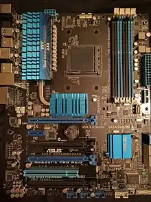 Motherboards usually have one or more expansion slots. These slots are most commonly a PCI (Peripheral Component Interconnect) slot, or a PCI-Express 16x slot. These slots are most commonly used to connect devices such as a video card, sound card, WLAN adapter, etc. they are normally aligned with a expansion card cutout on the computer case to allow for cables to be plugged into them. Most ATX motherboards will have two or three PCI-E 16x slots depending on the brand and how high-end the board is.
