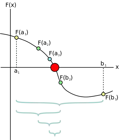 The bisection method starts with two guesses and uses a binary search algorithm to improve the answers. If a function is continuous between the two initial guesses, the bisection method is guaranteed to converge. Here is a picture that illustrates the idea: