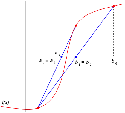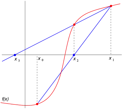 The following figure illustrates the secant method with two initial guesses and two successive improved estimates: