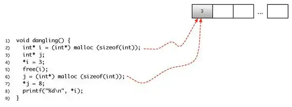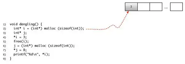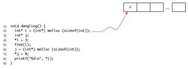 Now, let's stop for a bit and think of what happens on line 6). First, assume we are using a first fit strategy to allocate variables in the heap. From that assumption, as the first block of memory (the one previously used by i) is free, we can allocate j on it. And that's what happens, as we show below.