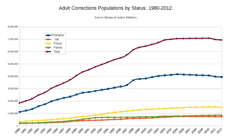 One of the more interesting features of the U.S. is the extensive number of people who are currently in the correctional system. One explanation for this is the increasingly punitive approach of the criminal justice system. According to Western (2007)[10], those who break laws in the U.S. today are twice as likely to be imprisoned as criminals a generation ago. While debated, the percentage of prison inmates who have been wrongly convicted of crimes is estimated to be somewhere between less than 1% all the way up to 9%, which could mean hundreds of thousands of prison inmates are actually innocent.[11] The figure below breaks down the correctional system population by the status of individuals in the correctional system, including: