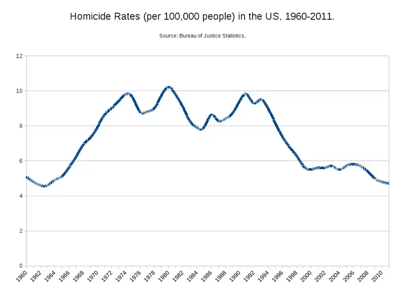 The chart below tracks homicide rates in the U.S. for the past 100 years. There has been an increase over time, though it is not clear whether that increase represents an actual increase in homicides or an increase in confounding factors, such as: stricter law enforcement, an increased willingness to report crimes, or changes in the definition of homicide itself.