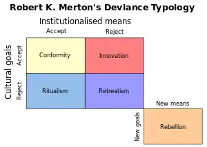Robert K. Merton, in his discussion of deviance, proposed a typology of deviant behavior. A typology is a classification scheme designed to facilitate understanding. In this case, Merton was proposing a typology of deviance based upon two criteria: (1) a person's motivations or his or her adherence to cultural goals; (2) a person's belief in how to attain his or her goals. These two criteria are shown in the diagram below. According to Merton, there are five types of deviance based upon these criteria: