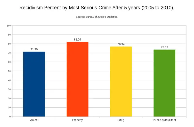 The U.S. has a relatively high recidivism rate (recidivism refers to the frequency of repeat offenses). More than half (some estimate around 67%) of prison inmates will be convicted on another charge within three years of having been released and return to prison.[12] This statistic is revealing of the nature of the prison system in the U.S.: it is more interested in keeping people who commit crimes away from the rest of the population than it is in attempting to reform or resocialize individuals to make them productive members of society. One factor that contributes to the high recidivism rates is the social stigma that accompanies having been convicted of a felony in the US. van Olphen et al. (2009)[13] found that individuals convicted of drug offenses were very likely to be reincarcerated, largely due to punitive punishments that accompanied their "convicted felon" stigma. For instance, they were often denied access to public housing and food stamps, which led many of the participants in the study to sell drugs to survive, leading to future arrests and convictions. The lack of help given to convicts released from prison increases the odds of those convicts returning to prison. Another factor that significantly increases the odds of convicts returning to prison is their return to their former neighborhoods.[14] Convicts who move away from their old neighborhood are substantially less likely to commit another crime; distancing themselves from the social environment that encouraged their criminal activity in the first place reduces their odds of reincarceration. Finally, the stigma associated with spending time in prison leads to substantially worse physical and mental health for ex-cons,[15] including higher rates of chronic illness, disability, psychiatric disorders, major depression, and anxiety.