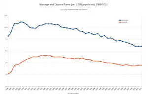 Another factor that contributes to high divorce rates is the change in laws that made divorce easier in the 1970s in the U.S.[49] The introduction of "No-fault divorce" laws removed the burden of proving that one's spouse had caused irreparable damage to the relationship (through adultery, battery, etc.). Women's rights advocates pushed for this change as it facilitated women's ability to exit unhealthy marriages.[49] Other factors that may have also contributed to the rise in divorces is a cultural mystique that suggests marriage should be blissful and not have any problems.[49] This is a common depiction of marriage in media, but is far from an accurate portrayal.[49] The unrealistic expectations many couples bring to marriage heightens the probability of divorce if things don't align with those expectations.