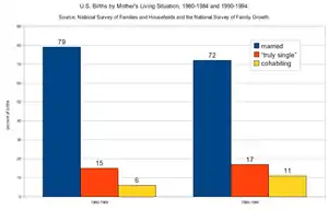 In the 1950s, most people believed that single-parent households were "immoral," but by 1978, only 25% of Americans held that belief.[4] Legal reforms in the 1960s and 1970s expanded the rights of nonmarital children and unwed mothers, breaking down the distinction between "legitimate" and "illegitimate". Additionally, the declining purchasing power of male wages in the 1970s along with the increased levels of education among women led to an increasing percentage of married women (with and without kids) to enter the workforce. This change in the economic structure of the U.S. (i.e., the inability to support a nuclear family on a single wage), had significant ramifications on family life. Women and men began delaying the age of first marriage in order to invest in their earning power before marriage by spending more time in school. The increased levels of education among women - women now earn more than 50% of bachelor's degrees - positioned women to survive, economically, without the support of a husband. By 1997, 40% of births to unmarried American women were intentional, and, despite a still prominent gender gap in pay, women are able to survive as single mothers.[4]