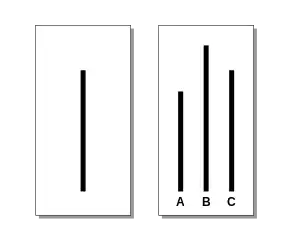 Research participants would enter a room and sit at a table with several other people (who were confederates, meaning they were actually helping with the research). The participant and confederates would be shown one card that had a reference line and another card that had three comparison lines. Subjects were required to select the comparison line that corresponded in length to the reference line.