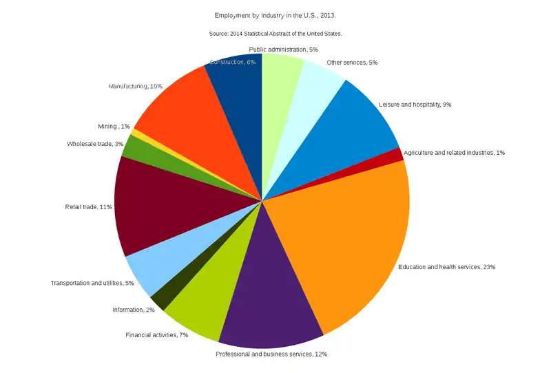 Most highly developed countries are now post-industrial in that the majority of their workforce works in service-oriented industries, like finance, healthcare, education, business or sales, rather than in industry or agriculture. This is the case in the U.S., as depicted in the pie chart above.