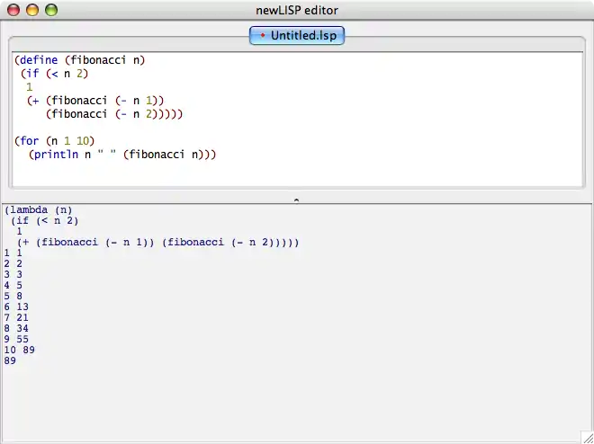 The visual interface to newLISP, newLISP-GS, provides a graphical toolkit for newLISP applications, and it also gives you a development environment in which to write and test code: the newLISP editor. On Windows, this is installed as a desktop icon and a folder in the Program Start menu. On MacOS X, an application package and icon is installed in the Applications folder. The newLISP-GS editor provides you with multiple tabbed windows, syntax colouring, and a monitor area for seeing the results of running your code.