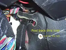 Once you have the kick panel removed, grab the edge of the carpet and pull toward the brake pedal. This will allow you to see the sound insulation on the inside of the firewall. You can see where this insulation fits around the main wiring harness (Fig 2). Take note of the bolt coming thru the small plastic fitting. This bolt will help you locate the firewall plug later.