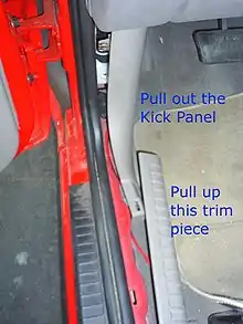 First off, you will need to remove the drivers side kick panel. Pull up on the lower door trim piece and pull out on the kick panel; these both use metal spring clips to fasten to the body (Fig 1).