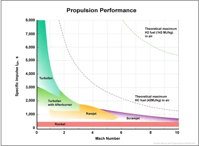 For a jet engine, the specific impulse can be determined from the specific fuel consumption. For example, an engine that has an SFC of 15mg/N-s will have a specific impulse of 6800s. Current turbofan engines have cruise SFC below 15.