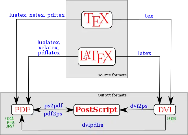 The boxed red text represents the file formats, the blue text on the arrows represents the commands you have to use, the small dark green text under the boxes represents the image formats that are supported. Any time you pass through an arrow you lose some information, which might decrease the features of your document. Therefore, you should choose the shortest route to reach your target format. This is probably the most convenient way to obtain an output in your desired format anyway. Starting from a LaTeX source, the best way is to use only latex for a DVI output, or only pdflatex for a PDF output, converting to PostScript only when it is necessary to print the document.