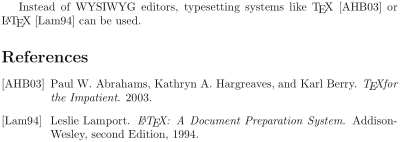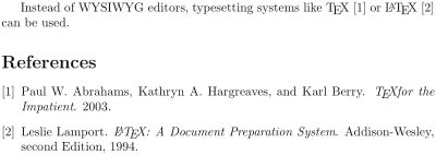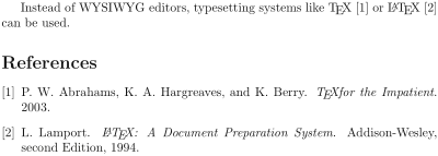 Instead of WYSIWYG editors, typesetting systems like \TeX{} or \LaTeX{} \cite{lamport94} can be used.