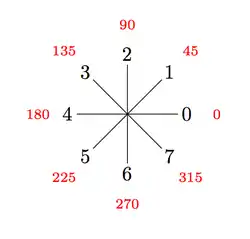 <angle> is the bond angle between two atoms (or nodes). There are three types of angles: absolute, relative, and predefined. Absolute angles give a precise angle (generally, 0 to 360, though they can also be negative), and are represented with the syntax [:<absolute angle>]. Relative angles require the syntax [::<relative angle>] and produce an angle relative to the angle of the preceding bond. Finally, predefined angles are whole numbers from 0 to 7 indicating intervals of 45 degrees. These are produced with the syntax [< predefined angle>]. The predefined angles and their corresponding absolute angles are represented in the diagram below.