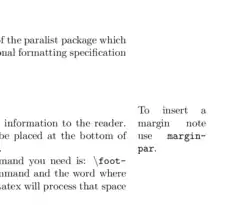 Margin Notes are useful during the editorial process, to exchange comments among authors. To insert a margin note use \marginpar{margin text}. For one-sided layout (simplex), the text will be placed in the right margin, starting from the line where it is defined. For two-sided layout (duplex), it will be placed in the outside margin and for two-column layout it will be placed in the nearest margin.
