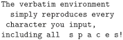There are several ways to introduce text that won't be interpreted by the compiler. If you use the verbatim environment, everything input between the begin and end commands are processed as if by a typewriter. All spaces and new lines are reproduced as given, and the text is displayed in an appropriate fixed-width font. Any LaTeX command will be ignored and handled as plain text. This is ideal for typesetting program source code. Here is an example:
